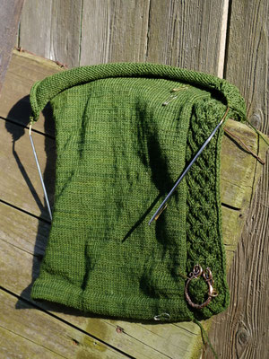 After a few months in time out I started another attempt at this cardigan. This time I used the basic construction of Raglano (which fits me well) and started from the top of the hood.