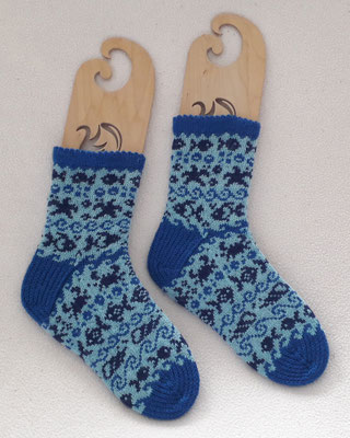 I like a dense fabric so I used 2mm needles. Unfortunately I ran out of pattern before the foot was long enough. So I added a wave pattern and the first row of fishes (from the leg).